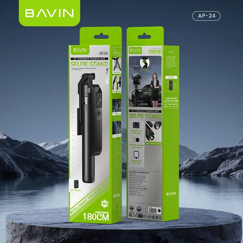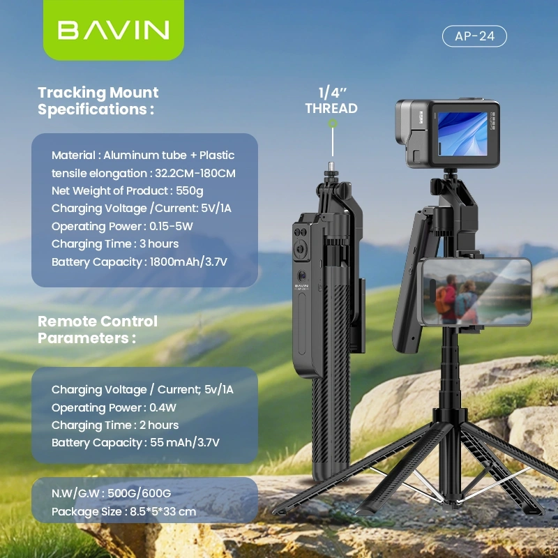 The BAVIN AP-24 is a revolutionary smart tracking mount and extendable tripod designed for content creators, vloggers, and streamers. Featuring a built-in 1800mAh battery for AI-powered face tracking and a detachable remote control, it allows you to capture smooth, professional video without a dedicated cameraman. Constructed from durable aluminum and plastic, it extends from 32.2cm to a massive 180cm, ensuring you always get the perfect angle for your smartphone or action camera.