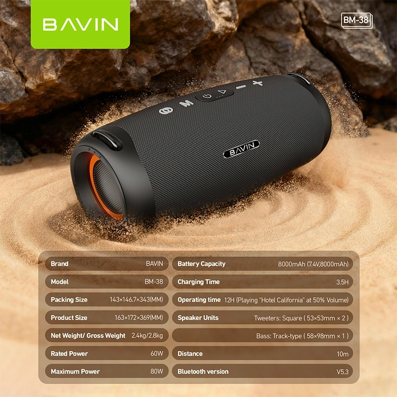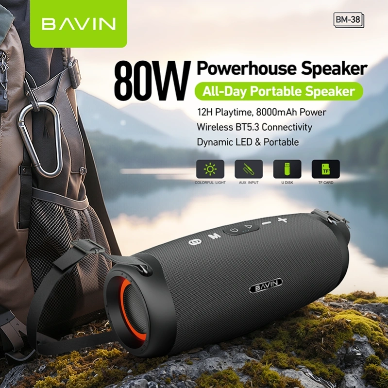Enjoy powerful sound on the go with the BAVIN BM-38 80W Powerhouse Portable Speaker. Featuring 80W high-power output, Bluetooth 5.3 connectivity, and an 8000mAh battery with up to 12 hours of playtime, it delivers immersive audio for outdoor adventures, parties, and everyday listening. With dynamic LED lighting and multiple input options including AUX, USB disk, and TF card, it offers versatile and stylish music playback anywhere.