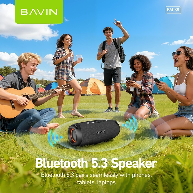 Its durable portable design with a comfortable carrying strap makes it easy to bring powerful sound anywhere you go. Whether you're exploring the outdoors, hosting friends, or simply enjoying music at home, the BAVIN BM-38 delivers powerful sound, long battery life, and modern connectivity in one stylish portable speaker.