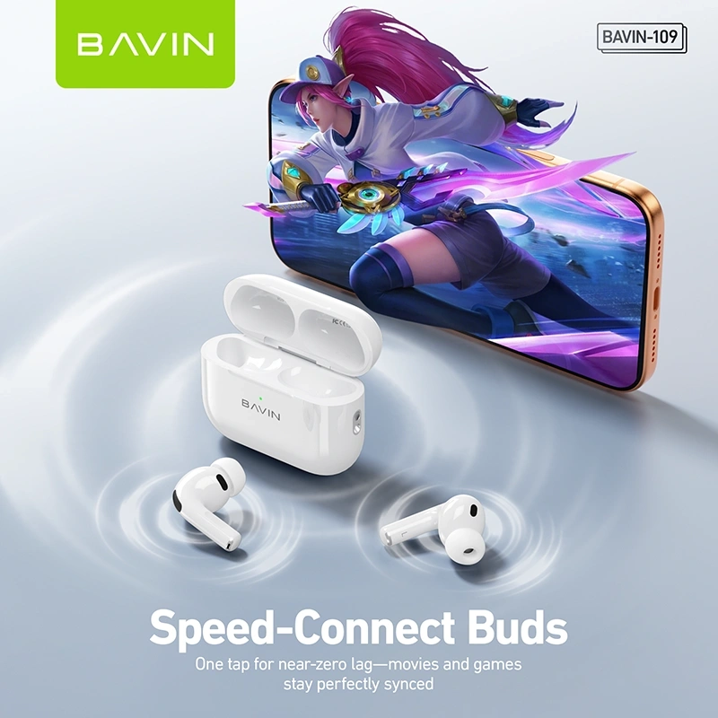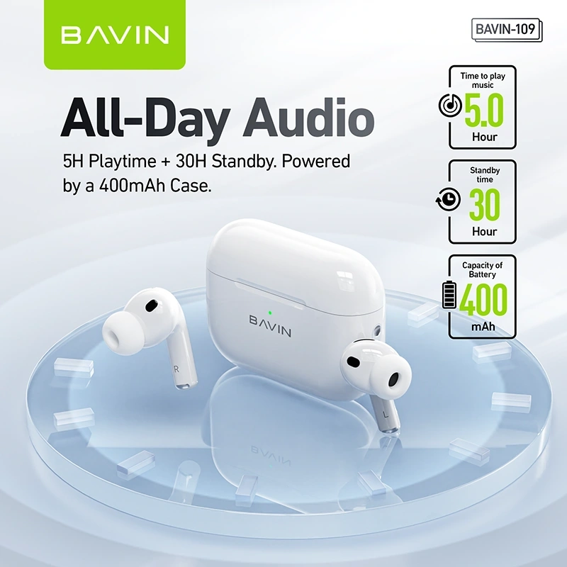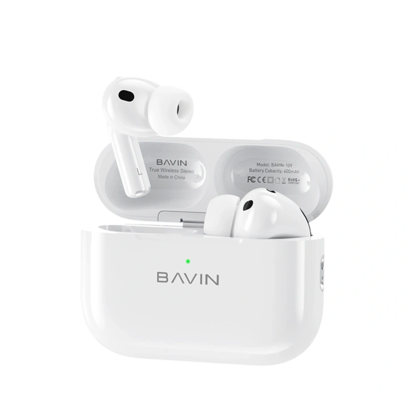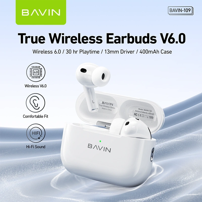 BAVIN-109 True Wireless Earbuds (Wireless 6.0) Upgrade your audio experience with the BAVIN-109. Boasting the latest Wireless 6.0 technology and a powerful 400mAh charging case, these earbuds provide up to 5.5 hours of continuous music and a long-lasting 30-hour standby time. With an ergonomic in-ear fit and fast Type-C charging, they offer the perfect balance of comfort, longevity, and high-fidelity sound.