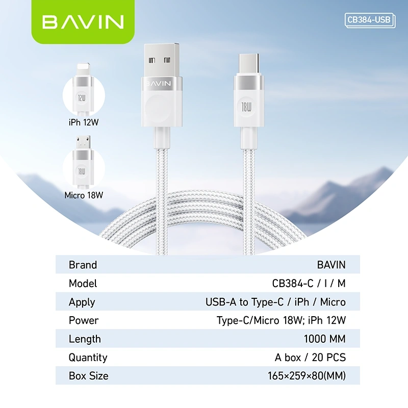 The BAVIN CB384 USB-Micro/ Lightning/ Type C Data Cable is a high-quality and durable cable designed for devices with a Micro-USB port. It is ideal for Android smartphones, tablets, Bluetooth devices, cameras, power banks, and other electronic accessories. With its USB-A to Micro-USB interface, it ensures wide compatibility with most wall chargers, laptops, and car chargers, making it a convenient choice for daily use.