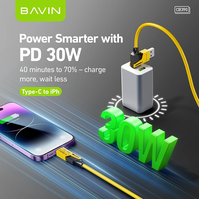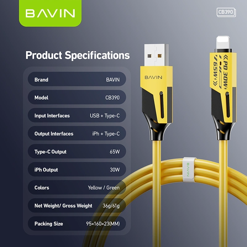 Versatile Bavin CB390 4-in-1 charging/data cable with multi-port design, supports 65W USB-C PD, 30W Type-C to iPhone, plus power/data sync for phones, tablets & laptops.