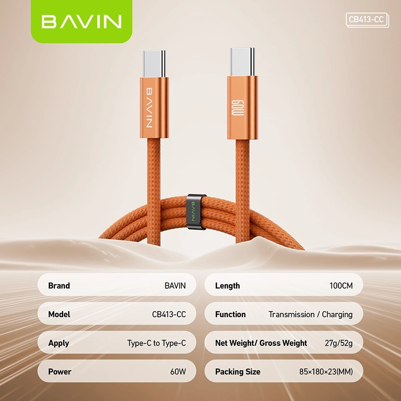 BAVIN CB413-CC 60W Braided Type-C to Type-C Fast Charging Cable Add a pop of color to your tech setup with the CB413-CC. This premium 1-meter cable supports 60W high-speed charging and rapid data transfer. Featuring a durable, high-density braided jacket and elegant aluminum alloy connectors, it is designed for maximum longevity and peak performance for laptops, tablets, and smartphones.
