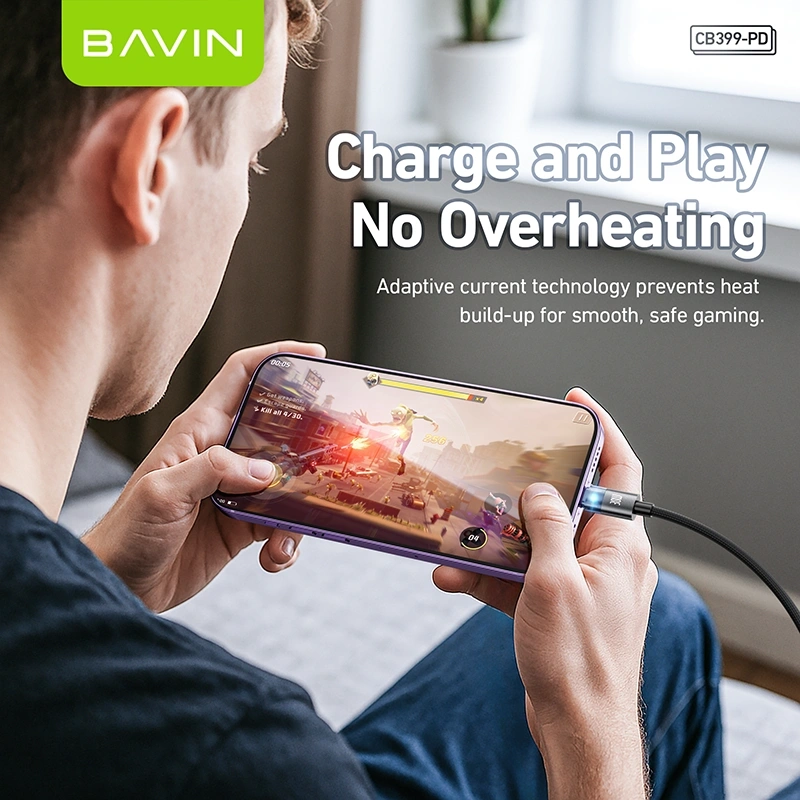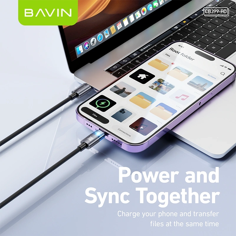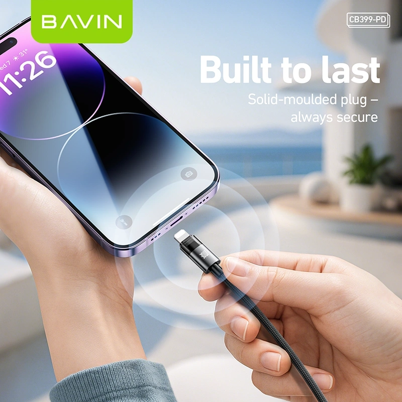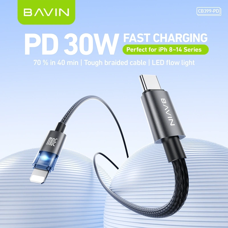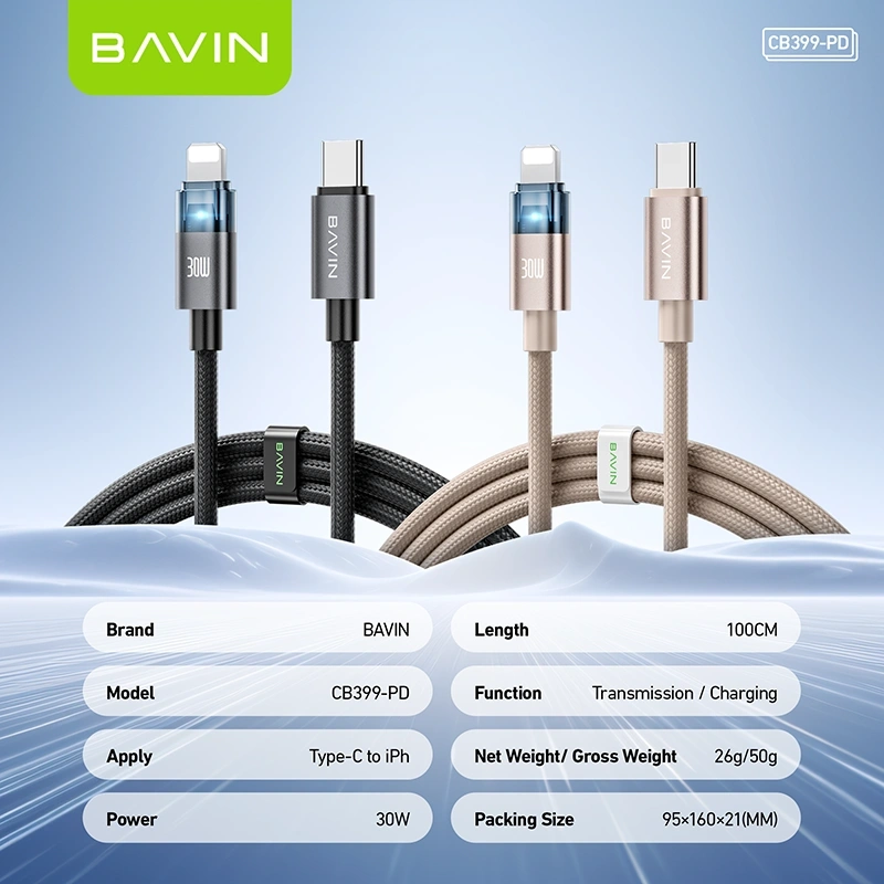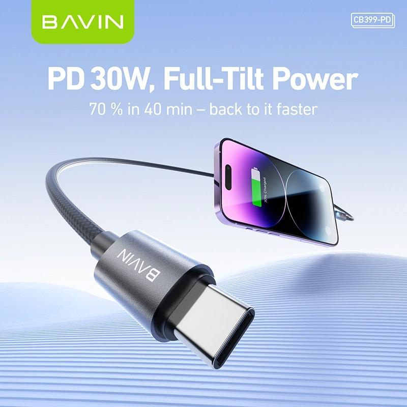 The BAVIN CB399-PD Type-C to iPhone Cable is designed for fast, efficient, and secure charging. Supporting up to 30W PD (Power Delivery) output, it enables rapid charging for compatible iPhone models when paired with a USB-C PD adapter.