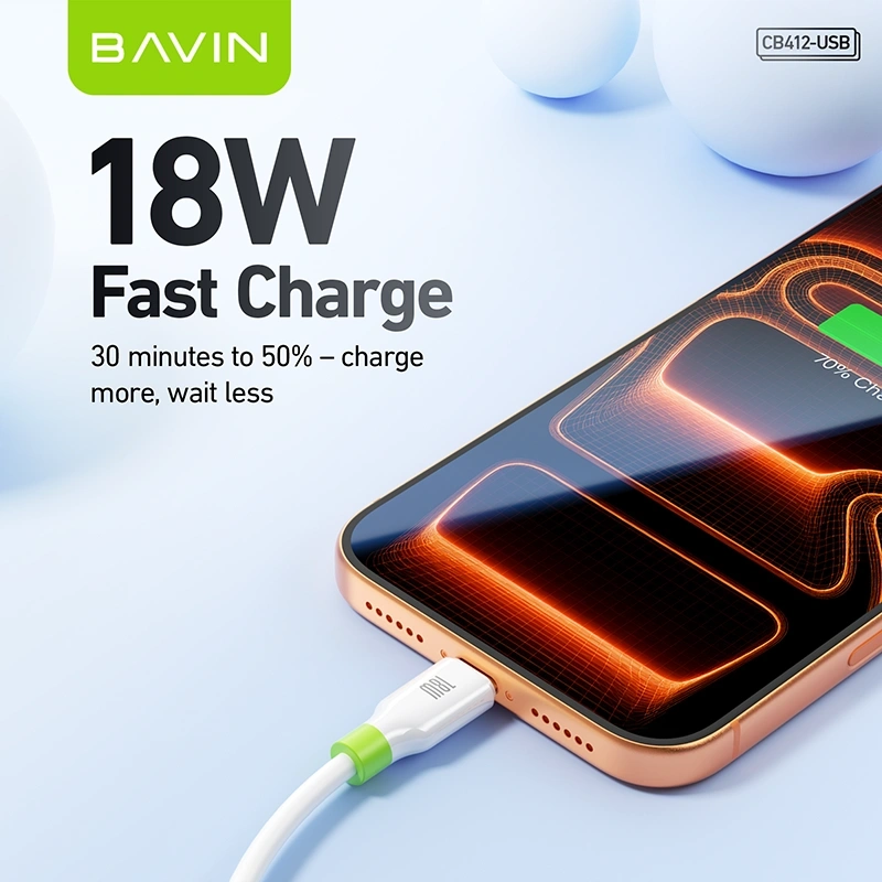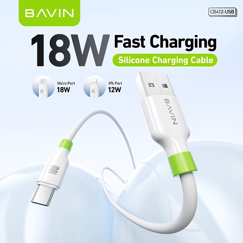The BAVIN CB412-USB Charging Cable is a reliable USB-A cable available in Type-C, iPhone (Lightning), and Micro USB variants. Supporting up to 18W fast charging (Type-C/Micro) and 12W for iPhone, this 1-meter cable ensures stable charging and data transmission in a lightweight, durable design.
