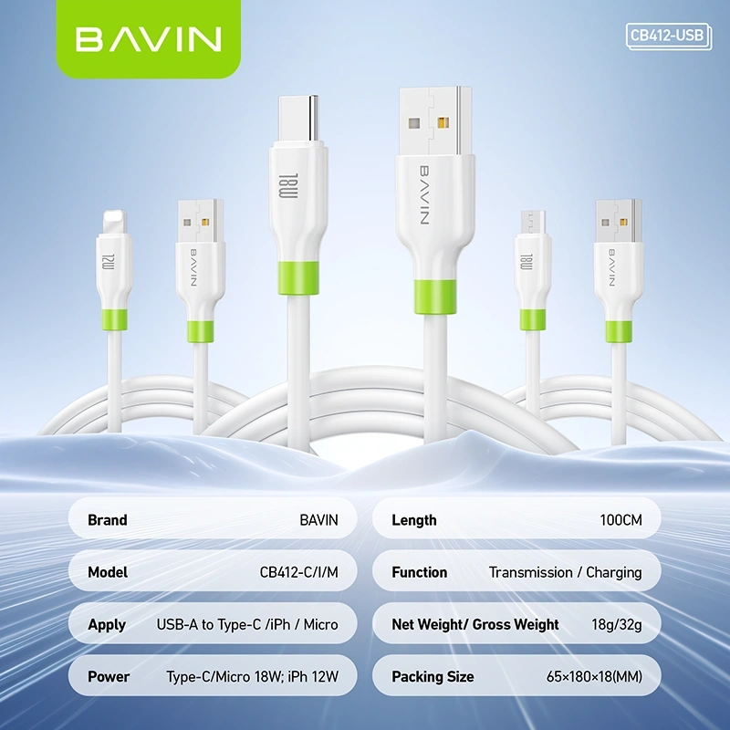 The BAVIN CB412-USB Series is designed to provide safe, efficient charging and dependable data transmission for everyday devices. With multiple connector options — USB-A to Type-C, USB-A to Lightning (iPhone), and USB-A to Micro USB — this cable series offers wide compatibility for smartphones, tablets, power banks, Bluetooth devices, and other USB-powered gadgets.