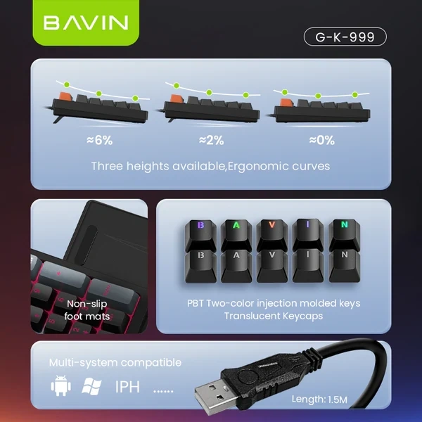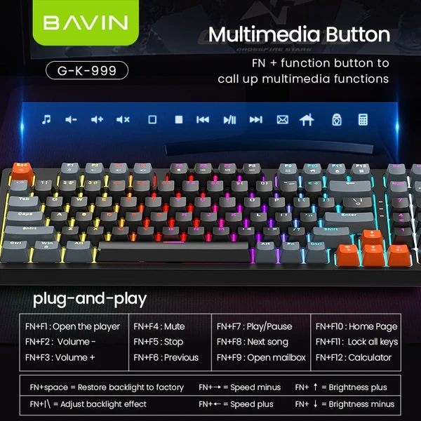 BAVIN G-K-999 96-Key Multimedia Gaming Keyboard Master your workflow and your gameplay with the G-K-999. Featuring a unique 96-key layout that includes a full number pad in a space-saving frame, this keyboard is equipped with dedicated FN-multimedia shortcuts and vibrant RGB backlighting. It’s the ultimate plug-and-play tool for those who need full functionality without the bulk of a standard keyboard.