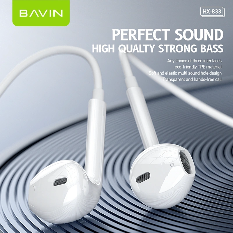 The BAVIN HX-833 Wired In-Ear Headset is a lightweight and comfortable earphone designed for everyday listening. With a 1.2 m durable cable and multiple plug options (3.5 mm, Type-C, and Lightning), it delivers clear sound and convenient compatibility with a wide range of devices. Its ergonomic in-ear design ensures a secure fit, making it perfect for music, calls, and daily use.