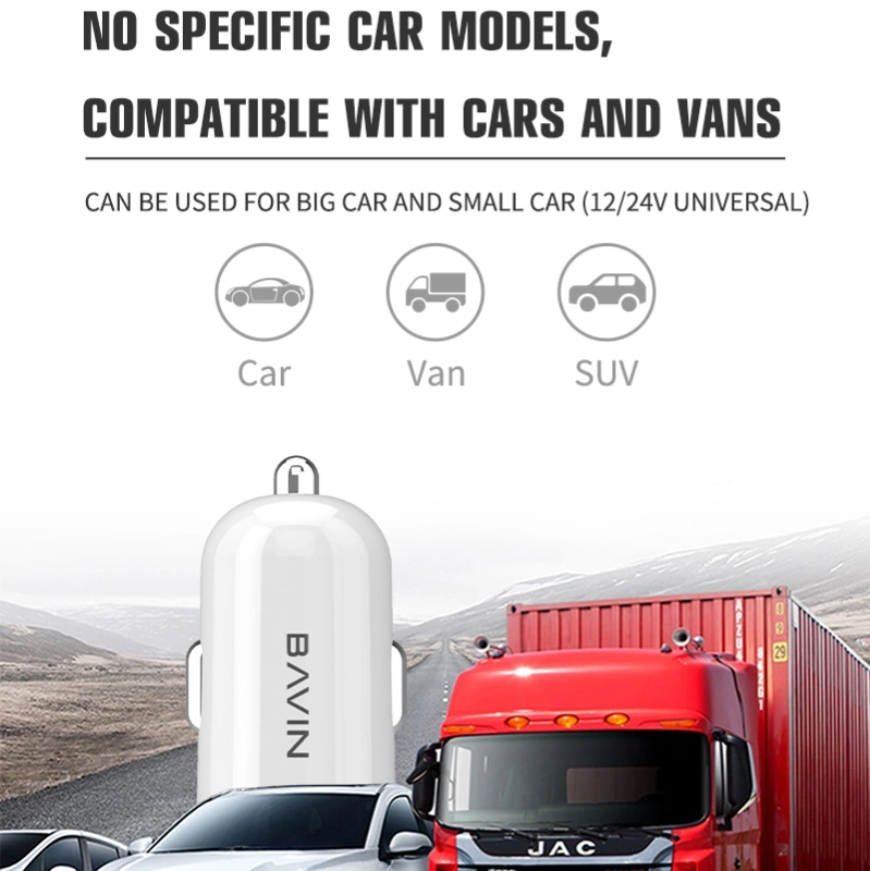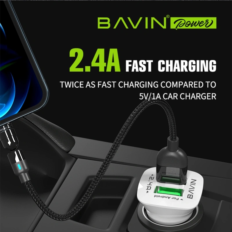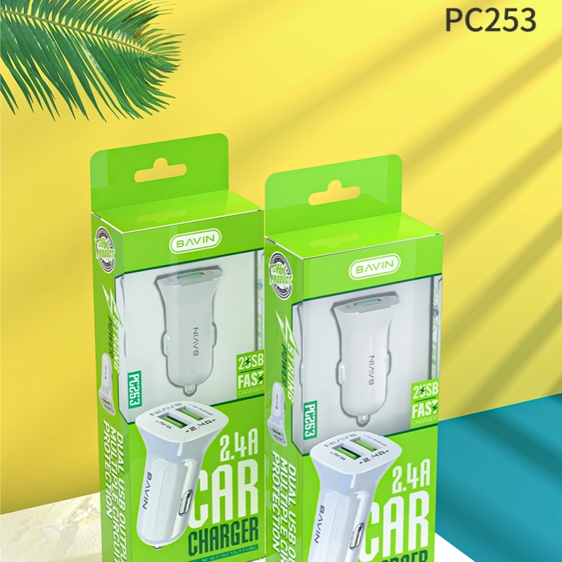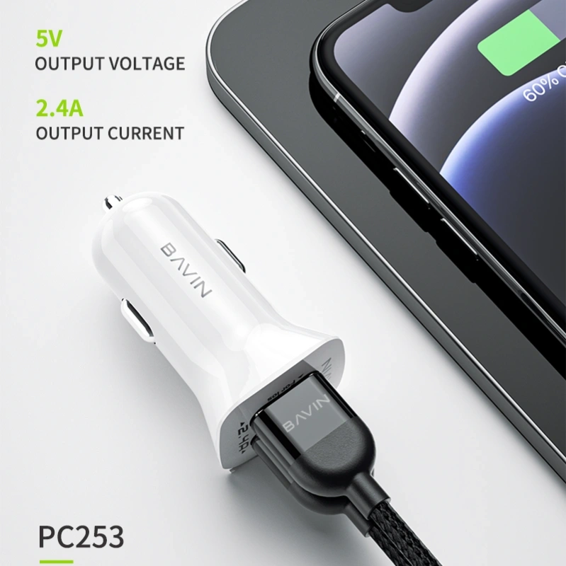 Bavin Car Charger PC253 — Dual USB‑A car charger with 2× USB ports (2.4 A total) for charging phones, tablets, and other USB devices via a 12–24 V car socket. Compact and safe with protection against overheating and overcurrent.