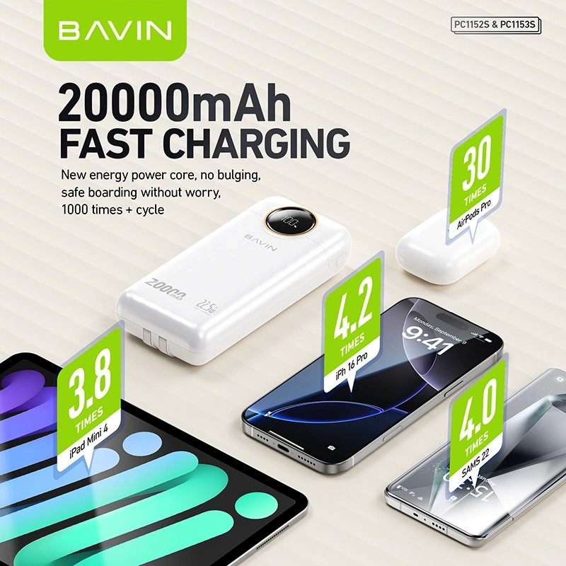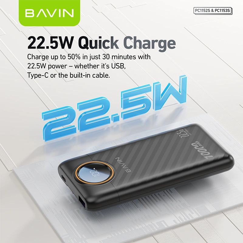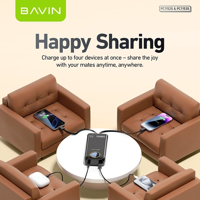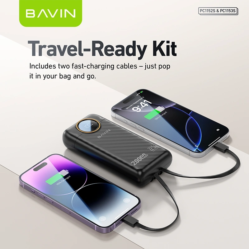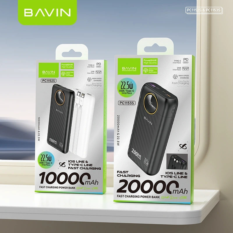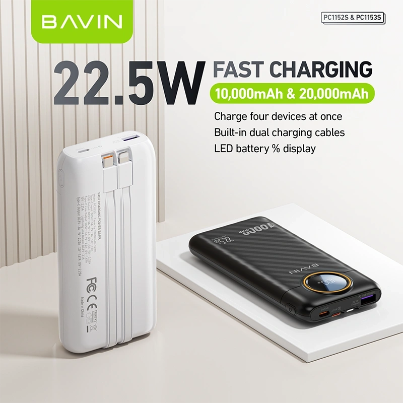 The BAVIN PC1152S & PC1153S Power Bank Series is engineered for users who need fast, versatile, and high-capacity portable power. Designed with modern multi-port functionality and integrated charging cables, this series offers efficient charging for smartphones, tablets, and other USB-powered devices.