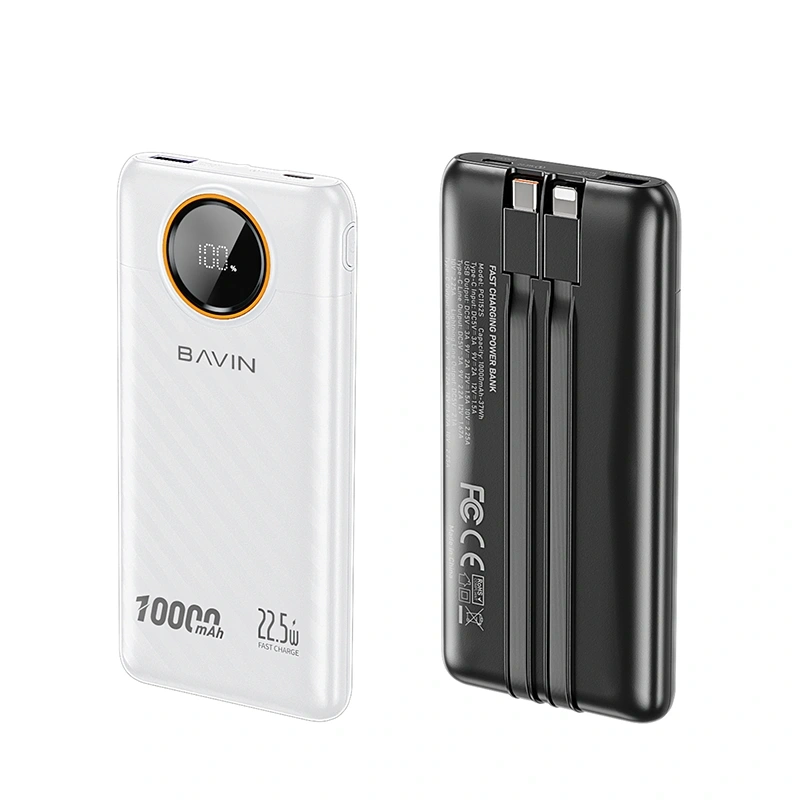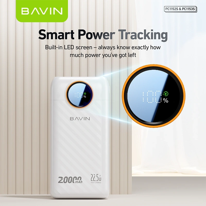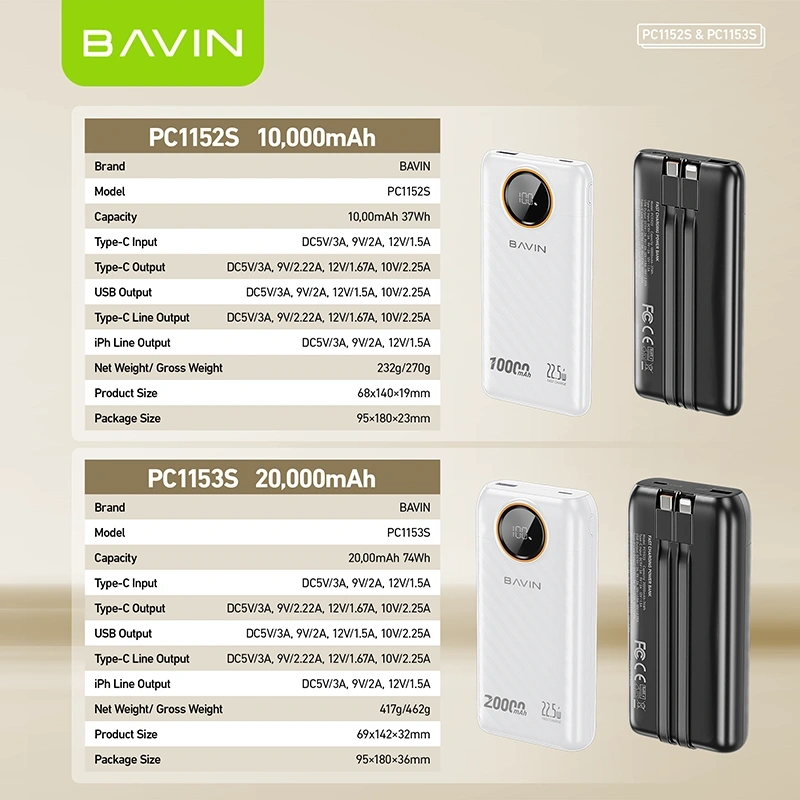 The BAVIN PC1152S (10,000mAh) and PC1153S (20,000mAh) power banks deliver high-speed charging with advanced multi-output support, including Type-C, USB-A, Type-C line, and iPhone line outputs. Featuring up to 22.5W fast charging and a smart LED display, they provide powerful, convenient charging for multiple devices on the go.