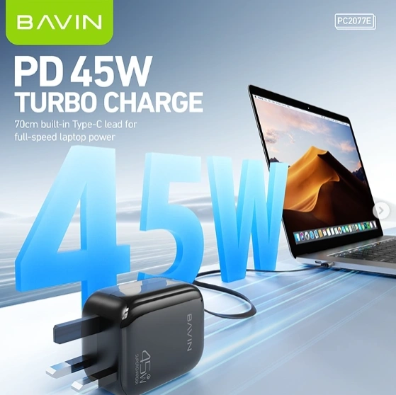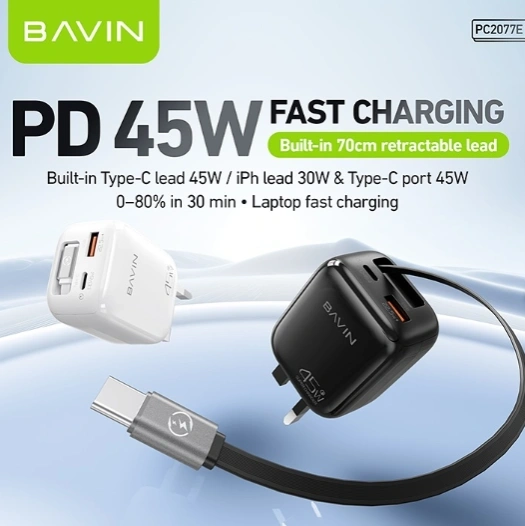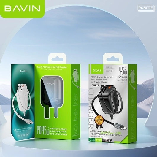 Bavin Lightning Charger PC2077E is a compact fast charger with built‑in Lightning and USB‑C ports, delivering efficient charging for iPhones and other devices with safety protections.
