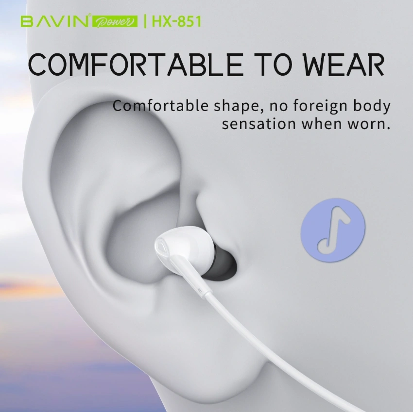 The BAVIN HX-851 Universal 3.5mm Wired Headset delivers clear, balanced sound in a compact and comfortable in-ear design. Equipped with a universal 3.5 mm interface, it is compatible with a wide range of smartphones, tablets, laptops, and audio devices. Its lightweight design and soft ear tips provide long-lasting comfort, making it perfect for music, calls, and everyday use.